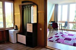 Благодаря раздвижным деревянным дверям, добавляющим уют и изюминку спальне и гостиной, номера трансформируются в двухкомнатный или однокомнатный, по желанию. Санузел и выход на балкон располагаются в спальне. Телевизор и обеденная зона - в гостиной.